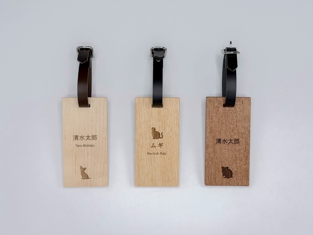 木製のネームプレートです。 ゴルフバッグや旅行かばんにつけて目印に。 ペットのカートやバギー、お散歩バックなどにも取り付けられます。 木目の魅力を活かした、存在感のある名札です。 ※一面の刻印です。 本体サイズ:木部 100×50×6mm 素材:木(メープル / レッドオーク / マコレ)、革ベルト 塗装:ミツロウオイル 重さ:約30g 炭素貯蔵量(CO2換算量):約0.03g-CO2